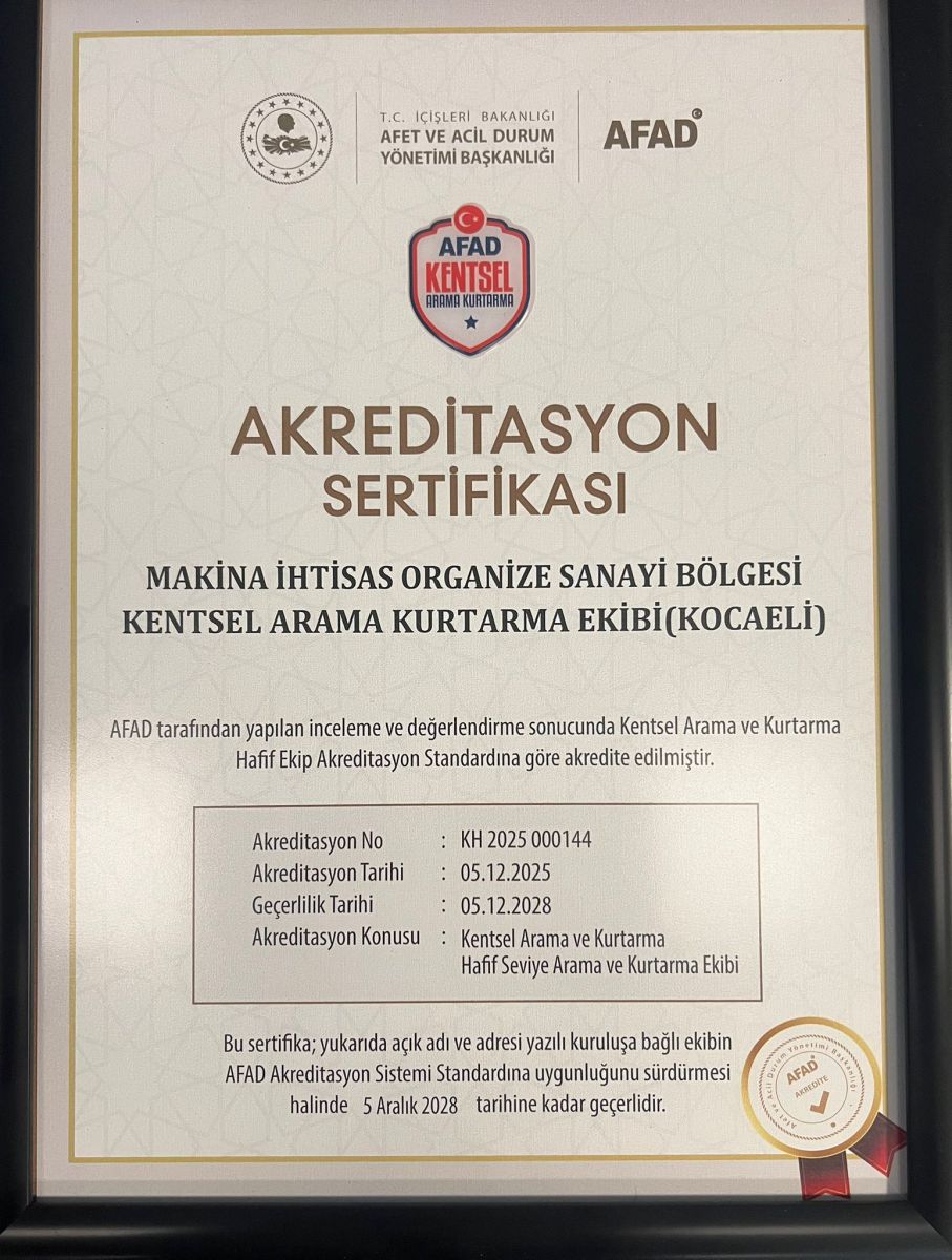 Türkiye Afet Müdahale Planı (TAMP) kapsamında yürütülen çalışmalar sonucunda, büyük çoğunluğu katılımcı firmalarımızın gönüllü çalışanlarından oluşan Makine İhtisas OSB Arama ve Kurtarma Ekibimiz, zorlu ve özveri gerektiren akreditasyon sürecini başarıyla tamamlayarak Kentsel Arama ve Kurtarma Ekibi Sertifikası almaya hak kazanmıştır.